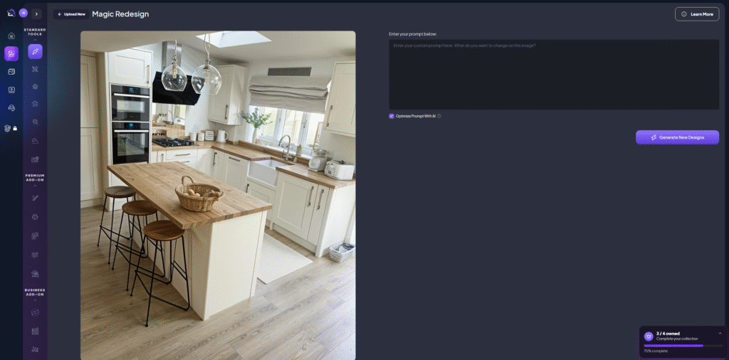 - ויזואליזציה של חללים: ניתן להעלות תמונות של החלל שברצונכם לעצב, וה-AI ינתח את התמונות וייצור הדמיות תלת מימדיות של החלל עם ריהוט, צבעים וחומרים שונים. לדוגמה ניתן לצלם את המטבח ולקבל הדמיית מטבח AI.